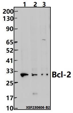 Western blot (WB) analysis of Bcl-2 (P65) pAb at 1:1000 dilution Lane1:The Kidney tissue lysate of Rat(30ug) Lane2:A2780 whole cell lysate(30ug) Lane3:A549 whole cell lysate(30ug)