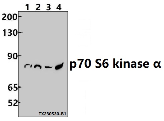 Western blot (WB) analysis of p70 S6 kinase α (T229) polyclonal antibody at 1:500 dilution Lane1:PC12 whole cell lysate(30ug) Lane2:CT26 whole cell lysate(30ug) Lane3:L02 whole cell lysate(30ug) Lane3:HEK293T whole cell lysate(30ug)