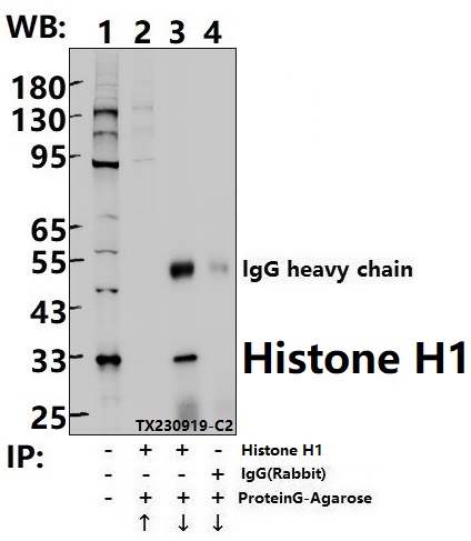 Immunoprecipitation of HEK293T cell lysates using Histone H1 (P13) pAb (Sepharose Bead Conjugate)#BD0048 (lane 2 and lane 3) and Nonspecific IgG Control (Sepharose Bead Conjugate)#BD0048 (lane 4) .Lane 1 is 30% input. The western blot was probed using Histone H1 (P13) pAb.