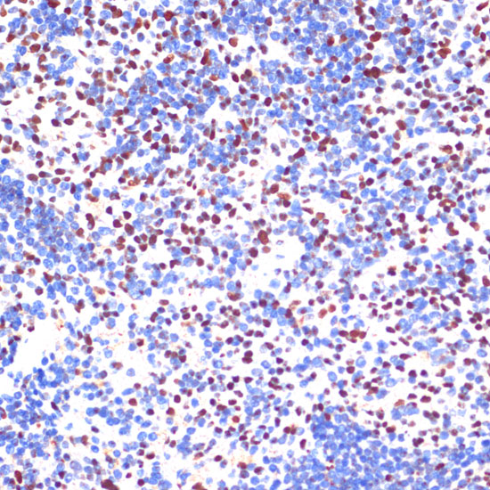 Immunohistochemistry of paraffin-embedded mouse spleen using PELP1 antibody at dilution of 1:100 .Perform microwave antigen retrieval with 10 mM PBS buffer pH 7.2 before commencing with IHC staining protocol.