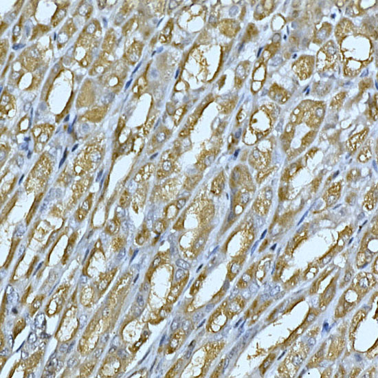 Immunohistochemistry of paraffin-embedded mouse stomach using RAB4A Rabbit pAb at dilution of 1:100 .Perform high pressure antigen retrieval with 10 mM citrate buffer pH 6.0 before commencing with IHC staining protocol.