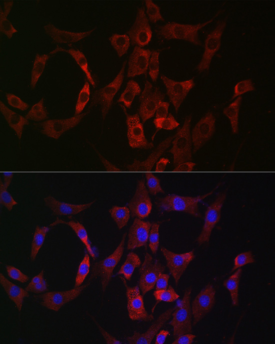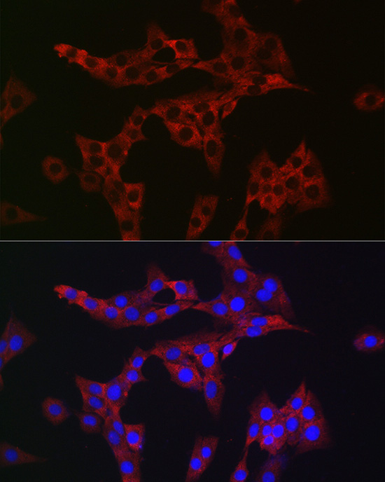 Immunofluorescence analysis of PC-12 cells using RAB4A Rabbit pAb at dilution of 1:150 . Blue: DAPI for nuclear staining.