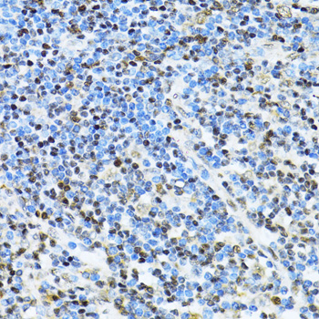 Immunohistochemistry of paraffin-embedded human appendix using ITGB3BP antibody at dilution of 1:100 .Perform microwave antigen retrieval with 10 mM PBS buffer pH 7.2 before commencing with IHC staining protocol.