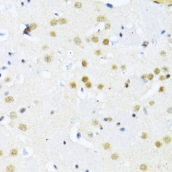 Immunohistochemistry of paraffin-embedded mouse brain using ITGB3BP antibody at dilution of 1:100 .Perform microwave antigen retrieval with 10 mM PBS buffer pH 7.2 before commencing with IHC staining protocol.