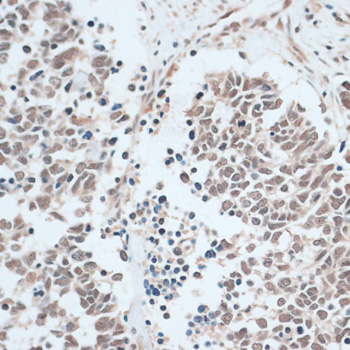 Immunohistochemistry of paraffin-embedded human lung cancer using ZNF416 antibody at dilution of 1:100 .Perform microwave antigen retrieval with 10 mM PBS buffer pH 7.2 before commencing with IHC staining protocol.