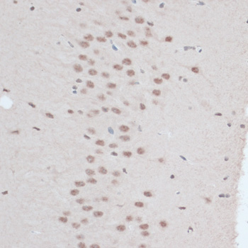 Immunohistochemistry of paraffin-embedded mouse brain using ZNF416 antibody at dilution of 1:100 .Perform microwave antigen retrieval with 10 mM PBS buffer pH 7.2 before commencing with IHC staining protocol.