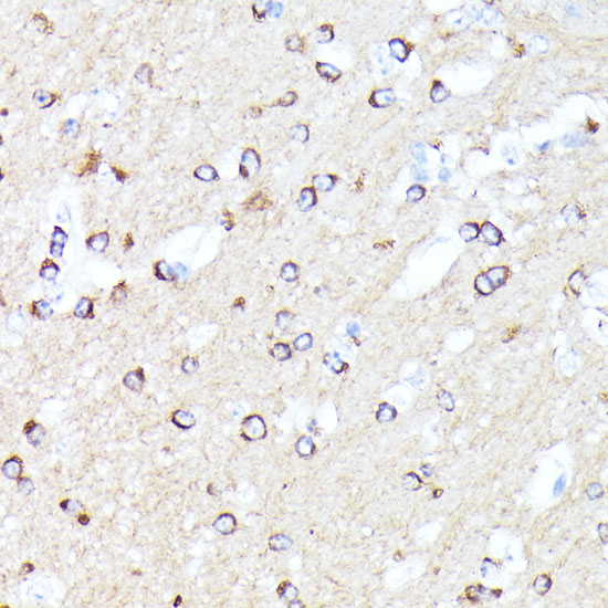 Immunohistochemistry of paraffin-embedded mouse brain using CCDC6 antibody at dilution of 1:100 .Perform microwave antigen retrieval with 10 mM PBS buffer pH 7.2 before commencing with IHC staining protocol.