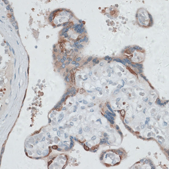 Immunohistochemistry of paraffin-embedded human placenta using HDAC7 antibody at dilution of 1:100 .Perform microwave antigen retrieval with 10 mM PBS buffer pH 7.2 before commencing with IHC staining protocol.