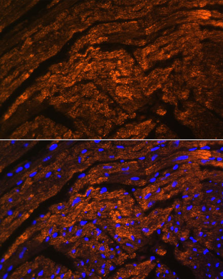 Immunofluorescence analysis of mouse heart using TTN antibody at dilution of 1:100. Blue: DAPI for nuclear staining.