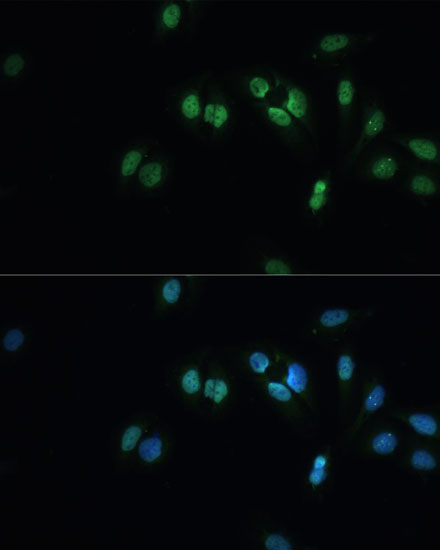 Immunofluorescence analysis of U-2 OS cells using TDP-43/TARDB Polyclonal Antibody at dilution of 1:100 . Blue: DAPI for nuclear staining.