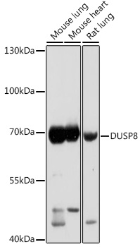 Western blot analysis of extracts of various cell line, using DUSP8 antibody at 1:1000 dilution.
