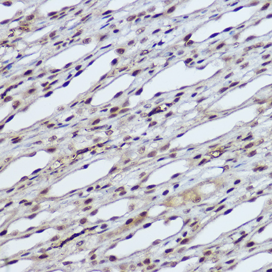 Immunohistochemistry of paraffin-embedded rat kidney using RBMY1A1 Rabbit pAb at dilution of 1:100 .Perform high pressure antigen retrieval with 10 mM citrate buffer pH 6.0 before commencing with IHC staining protocol.