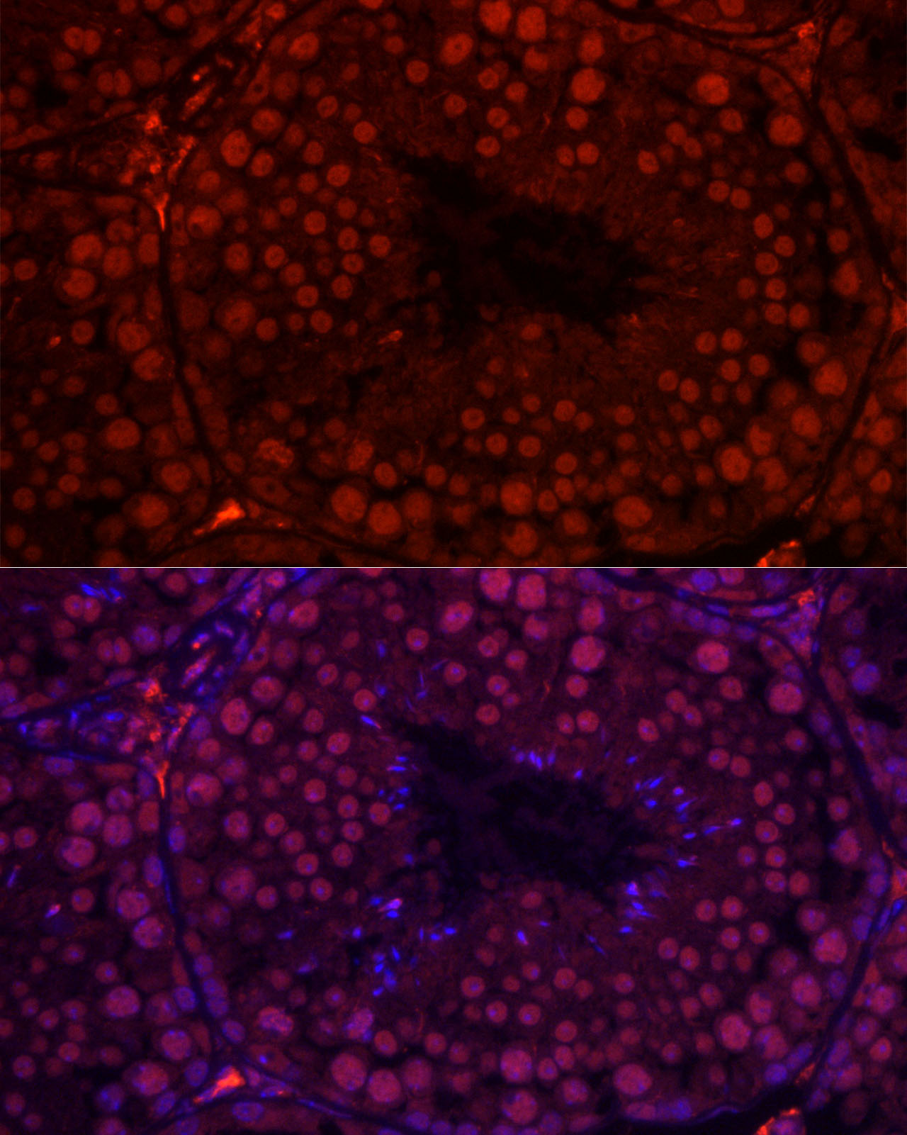 Immunofluorescence analysis of mouse testis cells using RBMY1A1 Rabbit pAb at dilution of 1:100 . Blue: DAPI for nuclear staining.