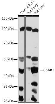 Western blot analysis of extracts of various cell lines, using C5AR1 antibody at 1:1000 dilution.