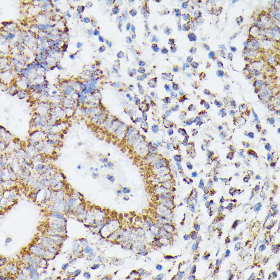 Immunohistochemistry of paraffin-embedded human colon carcinoma using RHOG antibody at dilution of 1:100 .Perform microwave antigen retrieval with 10 mM PBS buffer pH 7.2 before commencing with IHC staining protocol.