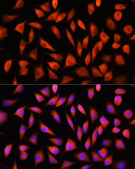 Immunofluorescence analysis of L929 cells using RHOG Rabbit pAb at dilution of 1:100. Blue: DAPI for nuclear staining.