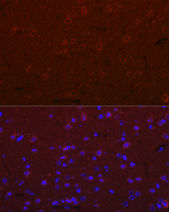 Immunofluorescence analysis of mouse brain cells using Versican Rabbit pAb at dilution of 1:100 . Blue: DAPI for nuclear staining.
