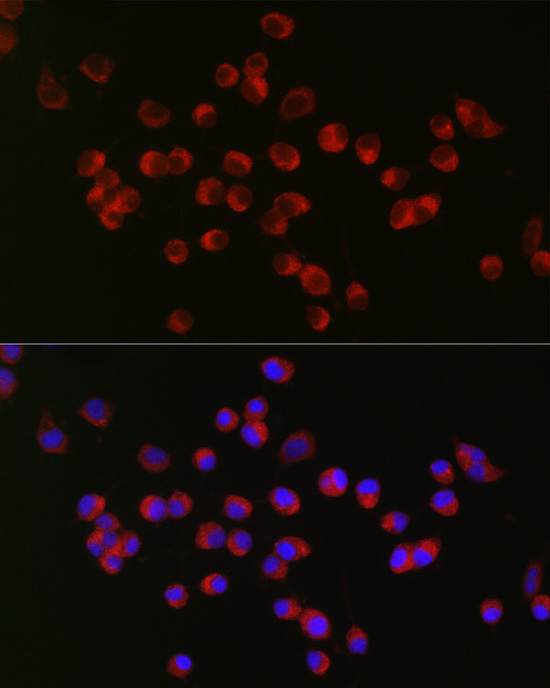 Immunofluorescence analysis of Neuro-2a cells using ANK3 Rabbit pAb at dilution of 1:200 . Blue: DAPI for nuclear staining.