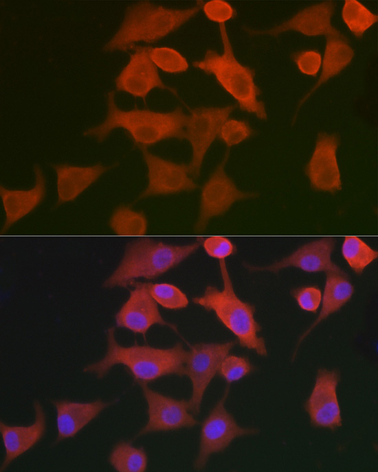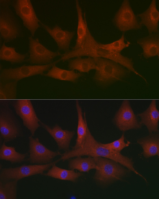 Immunofluorescence analysis of NIH/3T3 cells using AHNAK antibody at dilution of 1:100. Blue: DAPI for nuclear staining.