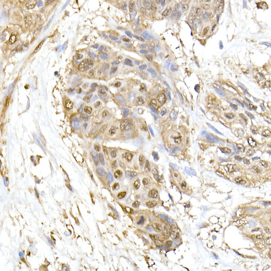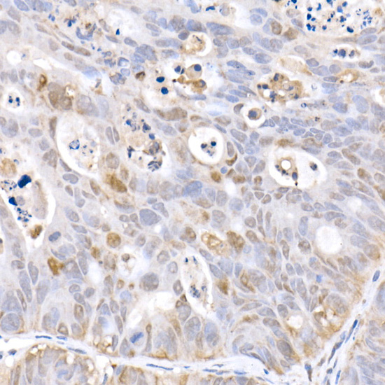 Immunohistochemistry analysis of paraffin-embedded Human colon carcinoma tissue using HSP70 pAb at a dilution of 1:100 (40x lens).