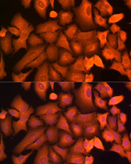 Immunofluorescence analysis of A-549 cells using HSP70 pAb at dilution of 1:100 (40x lens).