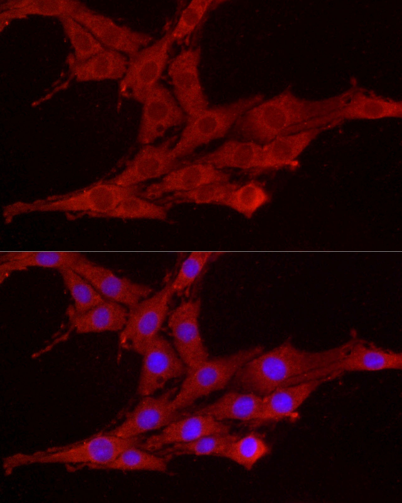 Immunofluorescence analysis of PC-12 cells using SMG1 Rabbit pAb at dilution of 1:200 . Blue: DAPI for nuclear staining.
