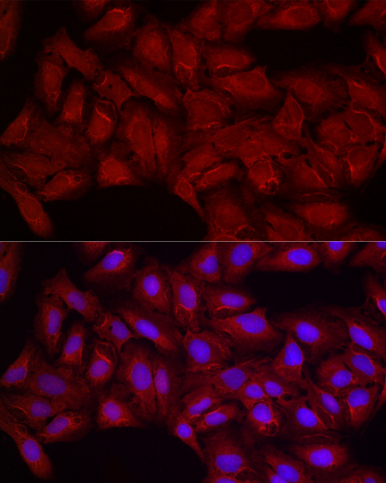 Immunofluorescence analysis of NIH/3T3 cells using SMG1 Rabbit pAb at dilution of 1:200 . Blue: DAPI for nuclear staining.
