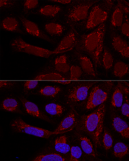 Confocal immunofluorescence analysis of U2OS cells using MTX1 Polyclonal Antibody at dilution of 1:100. Blue: DAPI for nuclear staining.