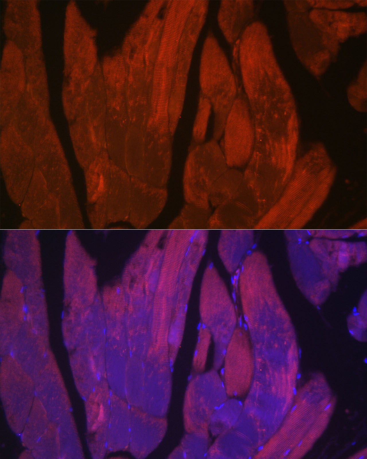 Immunofluorescence analysis of rat skeletal muscle cells using CACNA1S Rabbit pAb at dilution of 1:50 . Blue: DAPI for nuclear staining.