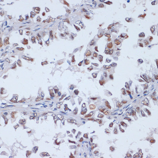 Immunohistochemistry of paraffin-embedded human lung cancer using DNMT3L antibody at dilution of 1:100 .Perform microwave antigen retrieval with 10 mM PBS buffer pH 7.2 before commencing with IHC staining protocol.