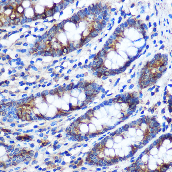 Immunohistochemistry of paraffin-embedded Human colon using STAT4 Rabbit pAb at dilution of 1:100 .Perform microwave antigen retrieval with 10 mM PBS buffer pH 7.2 before commencing with IHC staining protocol.