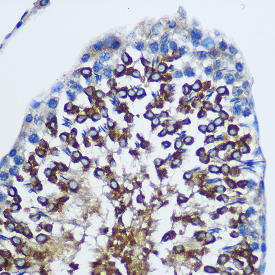 Immunohistochemistry of paraffin-embedded Rat testis using STAT4 Rabbit pAb at dilution of 1:100 .Perform microwave antigen retrieval with 10 mM PBS buffer pH 7.2 before commencing with IHC staining protocol.
