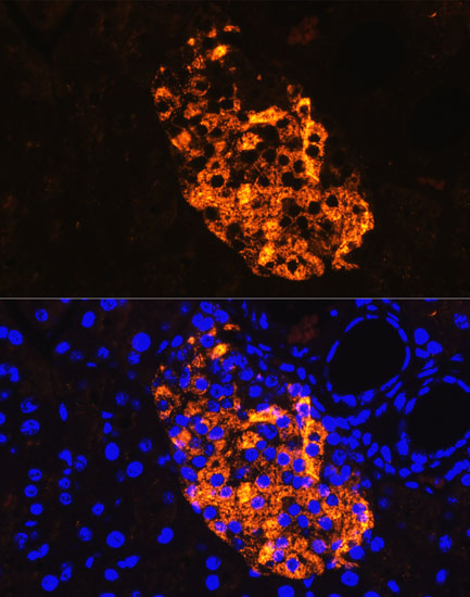 Immunofluorescence analysis of rat pancreas using IAPP antibody at dilution of 1:100. Blue: DAPI for nuclear staining.