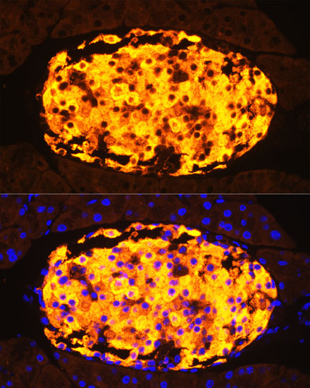 Immunofluorescence analysis of mouse pancreas using IAPP antibody at dilution of 1:100. Blue: DAPI for nuclear staining.