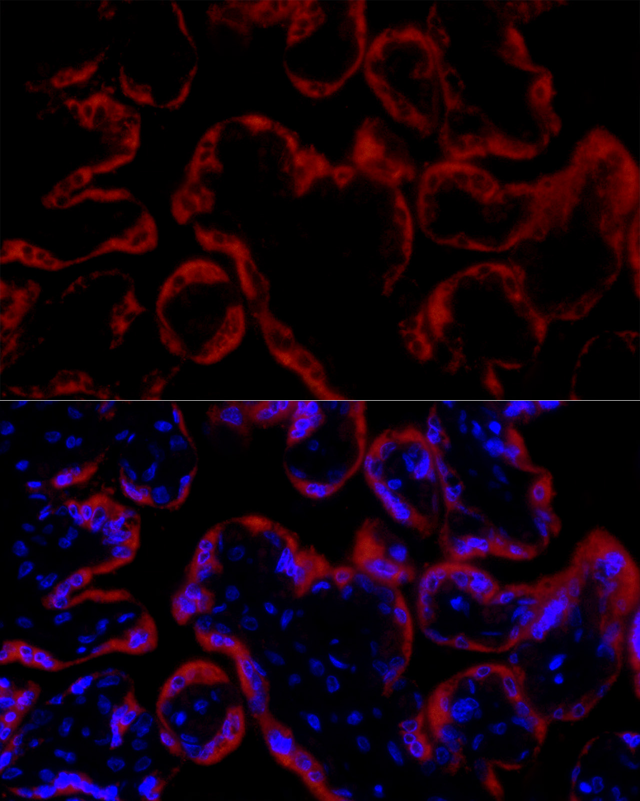 Immunofluorescence analysis of human placenta cells using GH1 Rabbit pAb at dilution of 1:25 . Blue: DAPI for nuclear staining.