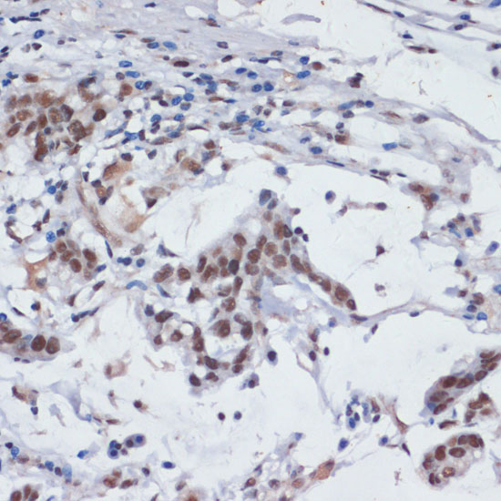 Immunohistochemistry of paraffin-embedded human gastric cancer using SRRT antibody at dilution of 1:100 .Perform microwave antigen retrieval with 10 mM PBS buffer pH 7.2 before commencing with IHC staining protocol.