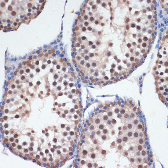 Immunohistochemistry of paraffin-embedded mouse testis using SRRT antibody at dilution of 1:100 .Perform microwave antigen retrieval with 10 mM PBS buffer pH 7.2 before commencing with IHC staining protocol.