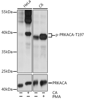 Western blot analysis of extracts of 293T cells, using Phospho-PKA C-alpha -T197 antibody at 1:1000 dilution. 293T cells were treated by Insulin for 10 minutes or treated by PMA/TPA for 30 minutes after serum-starvation overnight.