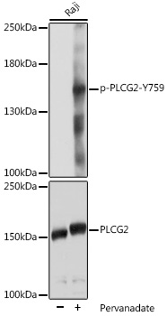 Western blot analysis of extracts of Raji cells, using Phospho-PLC gamma 2 -Y759 antibody at 1:2000 dilution or PLC gamma 2 antibody . Raji cells were treated by Pervanadate at 37℃ for 30 minutes.