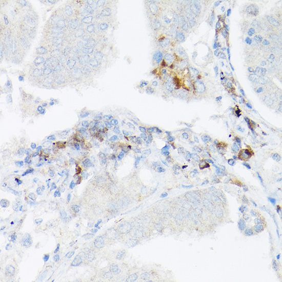 Immunohistochemistry of paraffin-embedded human lung cancer using TNF-α Rabbit pAb at dilution of 1:25 .Perform high pressure antigen retrieval with 10 mM citrate buffer pH 6.0 before commencing with IHC staining protocol.