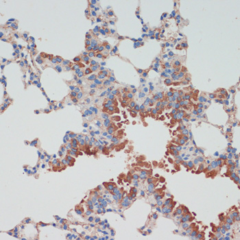 Immunohistochemistry of paraffin-embedded mouse lung using CHAT antibody at dilution of 1:200 .Perform microwave antigen retrieval with 10 mM PBS buffer pH 7.2 before commencing with IHC staining protocol.