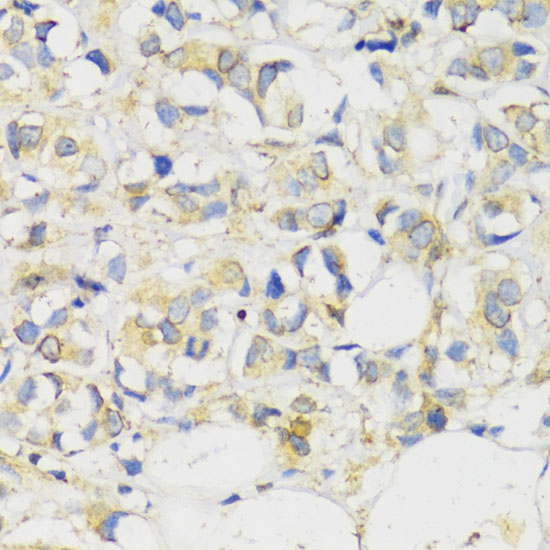 Immunohistochemistry of paraffin-embedded human breast cancer using MLKL antibody at dilution of 1:100 .Perform microwave antigen retrieval with 10 mM PBS buffer pH 7.2 before commencing with IHC staining protocol.