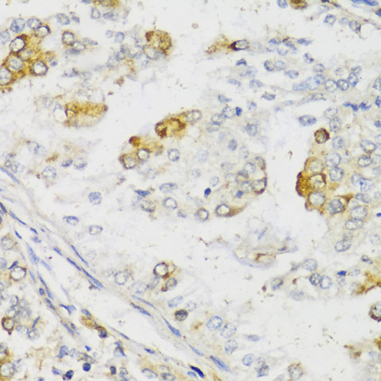 Immunohistochemistry of paraffin-embedded human uterine cancer using MLKL antibody at dilution of 1:100 .Perform microwave antigen retrieval with 10 mM PBS buffer pH 7.2 before commencing with IHC staining protocol.