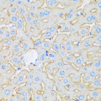 Immunohistochemistry of paraffin-embedded human liver using ASGR1 antibody at dilution of 1:100 .Perform microwave antigen retrieval with 10 mM PBS buffer pH 7.2 before commencing with IHC staining protocol.