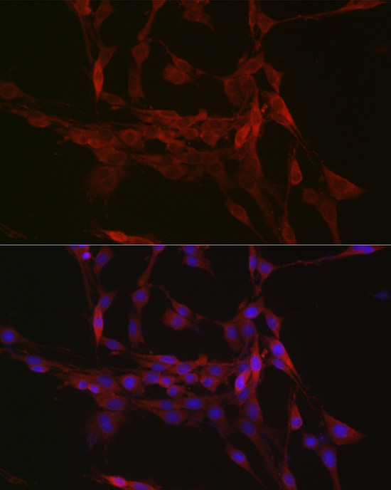 Immunofluorescence analysis of PC-12 cells using GSDMD pAb at dilution of 1:200 (40x lens).