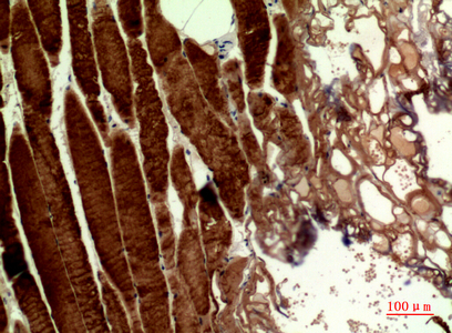 Immunohistochemistry analysis of paraffin-embedded Human muscle using MYH antibody.High-pressure and temperature Sodium Citrate pH 6.0 was used for antigen retrieval.