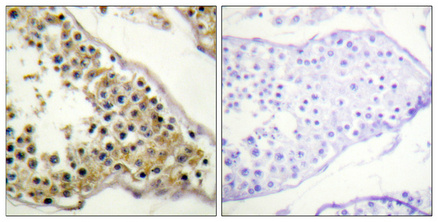 Immunohistochemistry analysis of paraffin-embedded Human testis using Phospho-ITK antibody.High-pressure and temperature Sodium Citrate pH 6.0 was used for antigen retrieval. Sample with blocking peptide on the right.