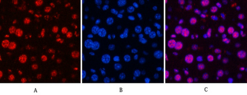 Immunofluorescence analysis of Cyclin B1 in mouse liver using Cyclin B1 antibody,and DAPI .