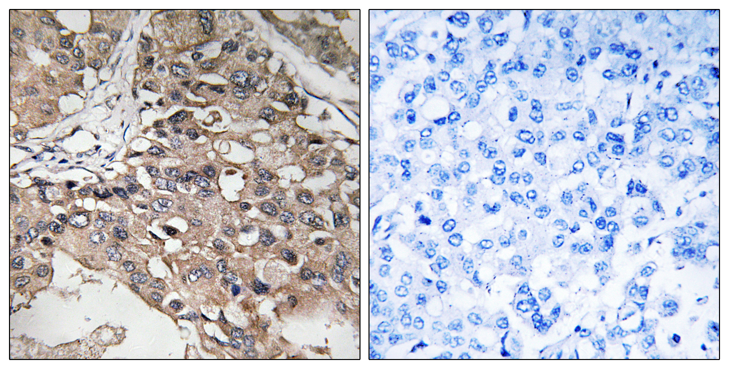 Immunohistochemistry analysis of paraffin-embedded Human breast carcinoma using TAK1 antibody.High-pressure and temperature Sodium Citrate pH 6.0 was used for antigen retrieval. Sample with blocking peptide on the right.