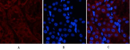 Immunofluorescence analysis of TAK1 in rat kidney using Tak1 antibody,and DAPI .